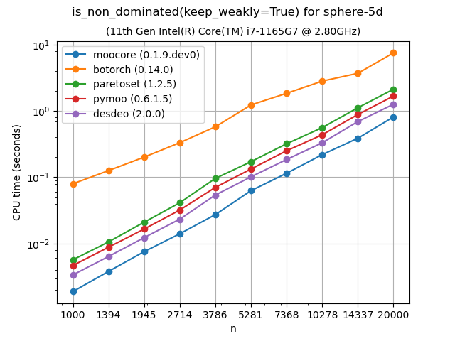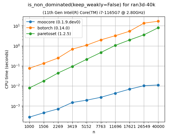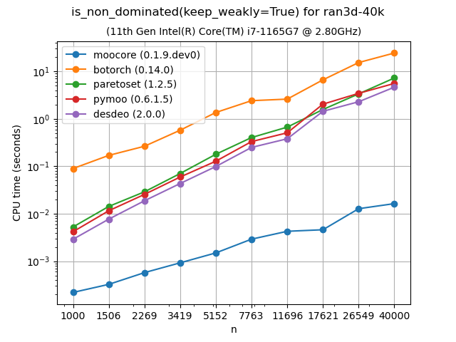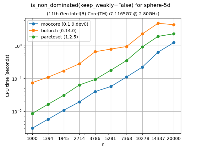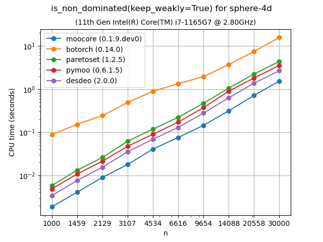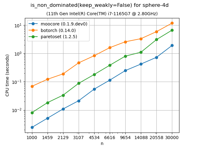 The following plots compare the speed of finding nondominated solutions, equivalent to moocore.is_nondominated()