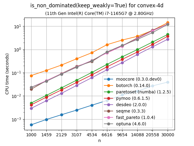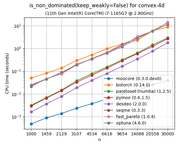 For 3D, Optuna uses a \(O(n^2)\) algorithm, while moocore uses the best-known \(O(n\log n)\) one, so the gap between the two will get significantly larger with a larger number of points than those tested here. moarchiving uses the same algorithms as moocore for 3D and 4D, but a pure Python implementation, so it is still 10-100 times slower than moocore’s C implementation. BoTorch and fast-pareto are not included for more than 3 objectives because they are tens of thousands of times slower than moocore. Nevergrad and Optuna are not included for more than 5 objectives for the same reason.