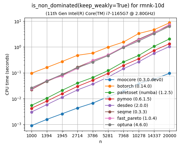 The following plots compare the speed of finding nondominated solutions, equivalent to moocore.is_nondominated(). We test both keep_weakly=False (the default) and keep_weakly=True. The former is only supported by BoTorch and paretoset. Thus, for the purpose of benchmarking the other packages with keep_weakly=False, we remove duplicated points from the data and exclude this time from the results. This makes all packages, except moocore, BoTorch and paretoset, seem faster than they actually are, because the user is forced to remove duplicated points when using them.