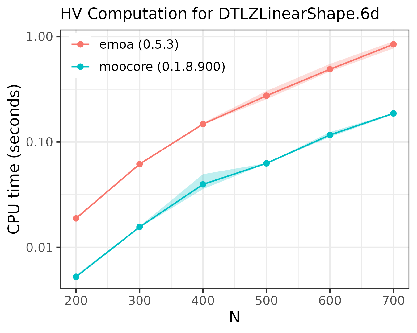The following plots compare the speed of computing the hypervolume indicator in 3D, 4D, 5D and 6D.